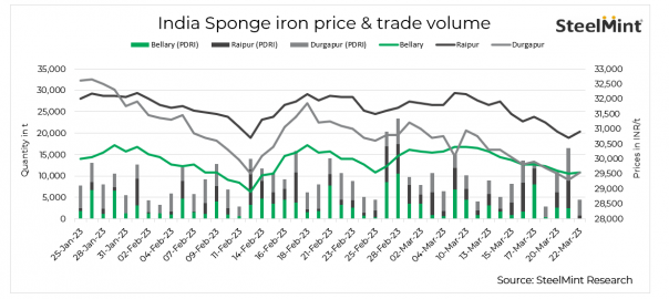 - Raipur: Sponge Iron prices showed an upward trend, although trade remained moderate. Material was booked at marginally higher offers. Markets in north India showed fluctuating trends, although sellers refused to reduce offers much.