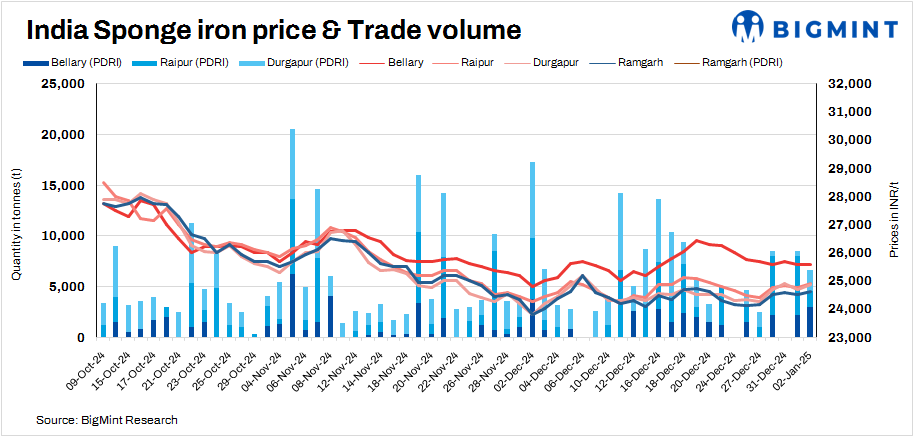 Transactions of about 9,600 t of sponge iron were seen in the country on 2 January, compared to 3,400 t on 1 January.