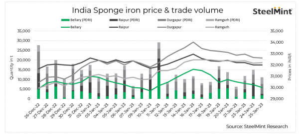 About 16,300 t of sponge iron transactions were recorded today in India as against 18,900 t on 24 January.