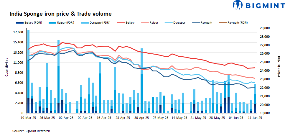 Approximately 12,150 t of sponge iron transactions were recorded in the country on Wednesday compared to 4,000 t on 10 June.