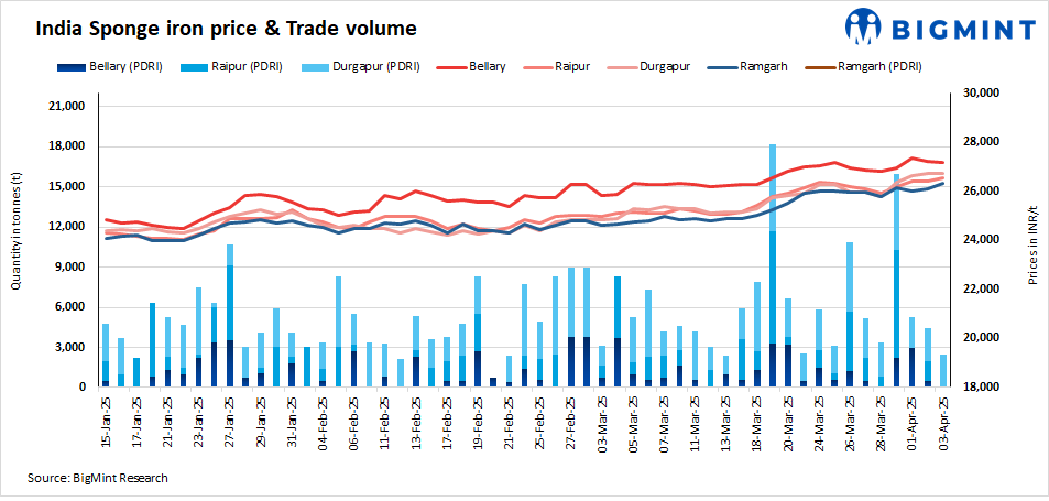 Approximately 4,500 tonnes (t) of sponge iron transactions were recorded in the country on Monday compared to 11,650 t on 2 April.