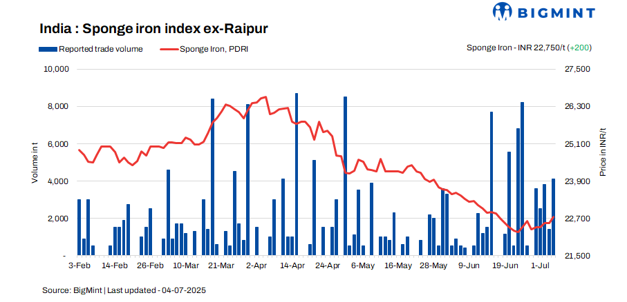 India’s sponge iron market exhibited mixed pricing trends on 4 July 2025, with prices rising by INR 100-300/tonne (t) in central and eastern regions. The upward movement was primarily driven by limited material availability and moderate restocking demand.