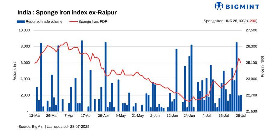 India’s sponge iron prices exhibited mixed trends across the country on 28 July 2025. Spot offers declined by INR 150-500/t across various regions due to weak inquiries and sufficient bookings already being placed in previous trading sessions. However, southern regions witnessed a price increase of INR 50-500/t, owing to tight availability.