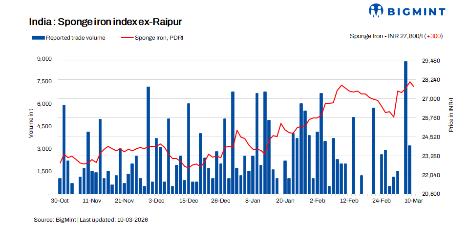 Indian sponge iron prices witnessed a mixed trend on 10 March. Prices fell by INR 100-400/t in the central and northern markets, while the eastern and southern regions recorded an uptick of around INR 50-400/t. Buying activity remained low to moderate, with limited enquiries across markets. Amid continuous price corrections, buyers largely adopted a wait-and-watch stance, leading to cautious and need-based procurement during the day.