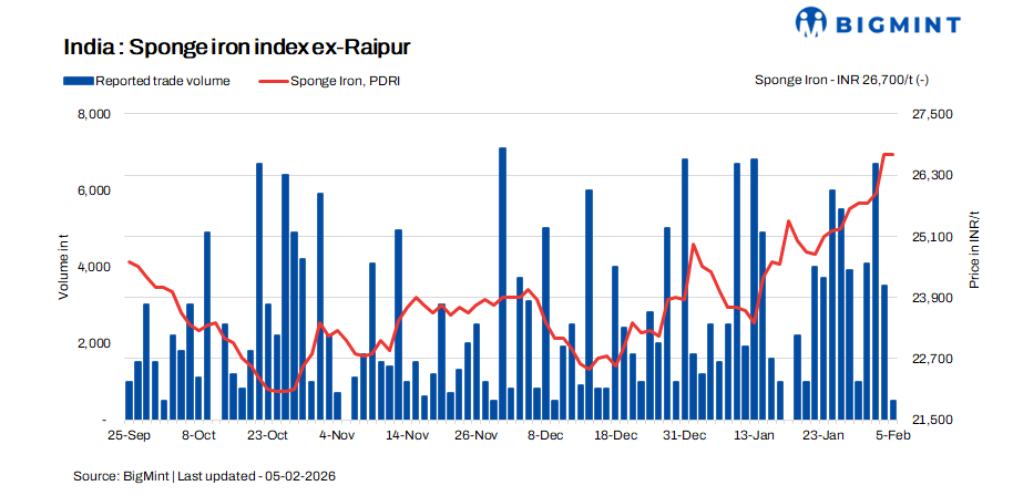 Sponge iron prices witnessed a mixed trend on 5th February, with stability in the central region, a marginal decline of around INR 100/t in the eastern markets, while the southern region recorded an uptick of INR 200-300/t. Market sentiment remained subdued, with limited participation observed during the day. Buying activity was low, as most buyers stayed on the side-lines and monitored price movements in anticipation of some adjustment in offers.