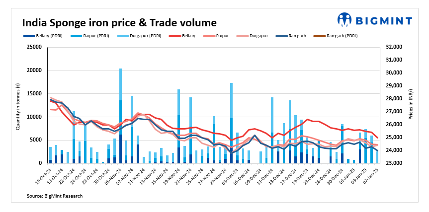 Sponge iron prices in India decreased today by INR 50-400/tonne (t) across regions due to weakened market sentiment. However, prices in Raigarh and Durgapur edged up by INR 50-100/t.