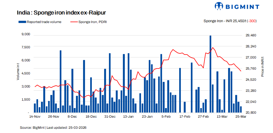 India’s sponge iron prices declined by INR 100-500/t across regions on 25 March, with Raigarh recording the sharpest correction of around INR 500/t. Buying activity remained low to moderate during the day, with only limited transactions taking place. However, some improvement in enquiries was observed as the recent price correction attracted interest from buyers.