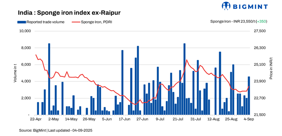 India’s sponge iron prices witnessed a sharp rise of INR 200-500/tonne (t) d-o-d across major regions, led by Raigarh. The surge was supported by improved spot inquiries and positive sentiment following GST-related developments, which boosted buying interest.