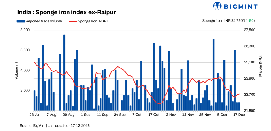 Sponge iron prices across major markets increased by INR 50-250/t on 17 December 2025, supported by improved sentiment and firmer offers from key producers. The positive momentum was largely influenced by price gains in the finished steel segment, where rates moved up by INR 100-500/t, which further strengthened sentiment.