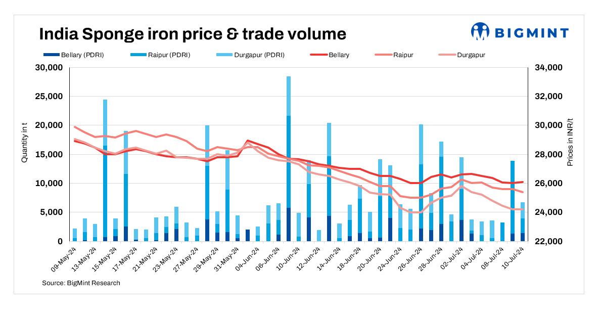 Indian sponge iron prices dropped in the range of INR 50-300/tonne (t) in some key locations on 10 July, 2024. On the other hand, prices in south India increased by INR 100-200/t.
