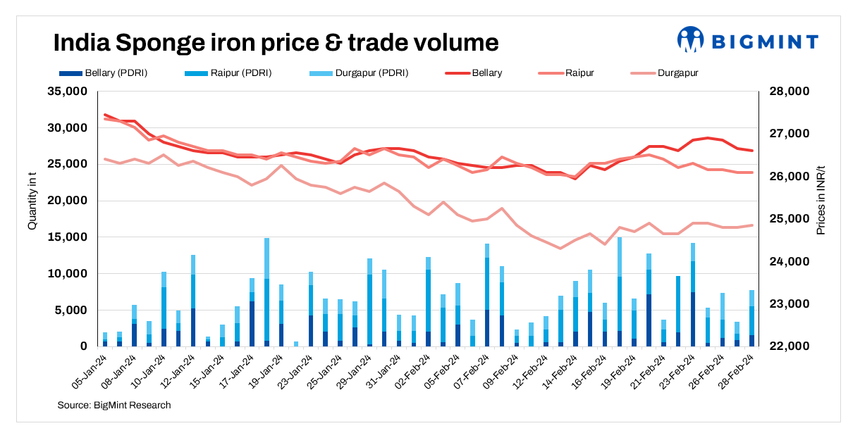 Sponge iron prices in India witnessed a decrease of INR 50-150/t in some major regions on 28 February, 2024.