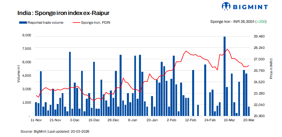 India’s sponge iron prices edged up by INR 50-300/t across most regions, while the Chennai market saw a correction of up to INR 400/t. Buying activity remained subdued to moderate, as the recent uptick in prices prompted resistance from buyers at elevated levels. Moreover, improved procurement during the previous sessions—when prices had softened—led to reduced fresh bookings today, keeping overall trading activity relatively limited.