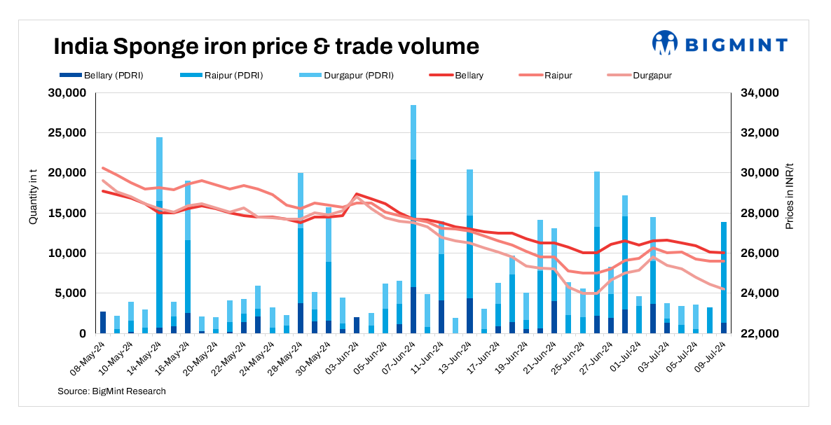 Prices of sponge iron in India declined by INR 50-750/t across regions today due to weak demand for finished steel and generally weak market sentiments.