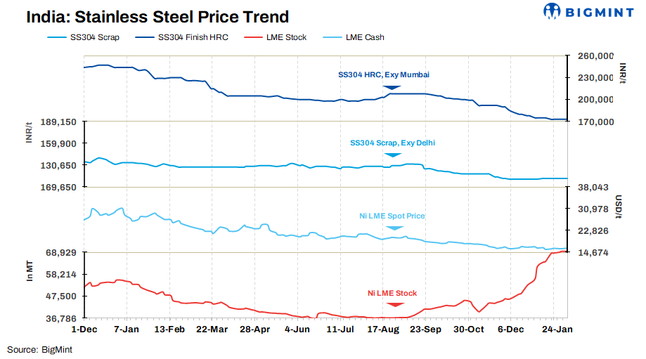 As per SteelMint’s assessment, 304-HRC is currently priced at INR 173,000/t ($2,081/t), while 304-grade CR prices are in the range of INR 184,000/t ($2,214/t) exw-Mumbai, largely stable against last week. Market participants are adopting a cautious stance due to restrained sales of finished materials.