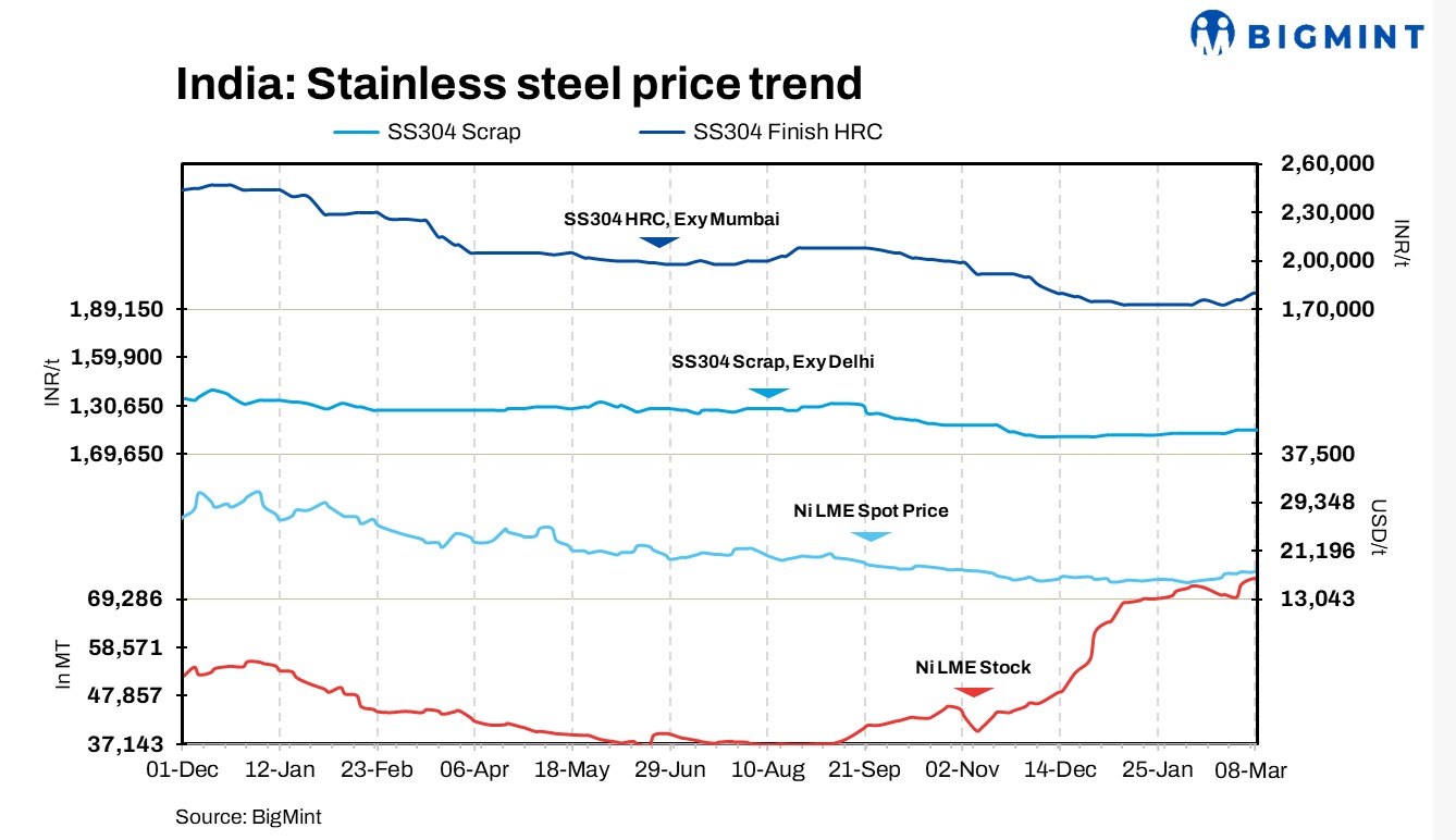 The stability persisted in both India’s domestic and imported stainless steel markets. BigMint’s assessment for 304-grade scrap was INR 116,000/t, and for 316-grade, it stood at INR 212,000/t, ex-Delhi. In the imported sector, prices for 304 and 316-grade were at $1,350/t and $2,525/t, CFR Mundra. Nevertheless, market demand remained subdued, with only a few transactions taking place.