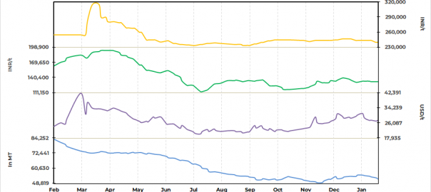 • Domestic stainless steel scrap 304 grade prices remained stable at INR 129,000/t ($1,569/t) ex-Delhi today as against 31 Jan’23.