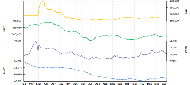 - Domestic stainless steel scrap (304 grade) prices decreased by INR 1,000/t ($12/t) from 10 Jan’23 to INR 133,000/t ($1,631/t) ex-Delhi today amid limited buying interest and a drop in LME nickel prices to $27,039/t.