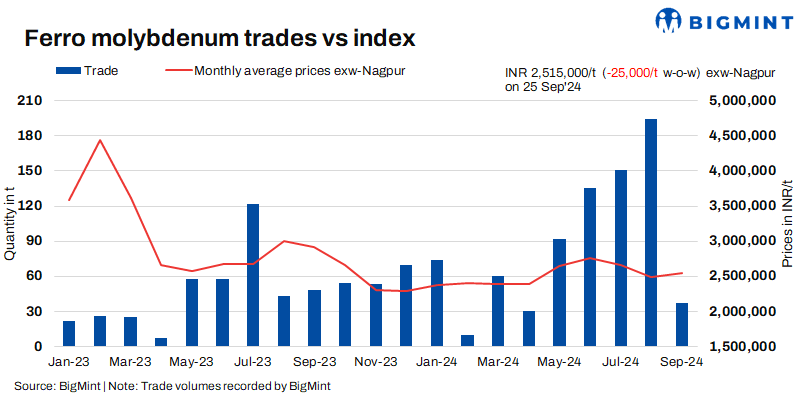 Steady global, domestic demand: The ferro molybdenum market has been stagnant over the last few weeks and hence, no major variations were observed in prices. Prices of imported molybdenum oxide to India were stable too w-o-w at $21.4-21.5/lb.