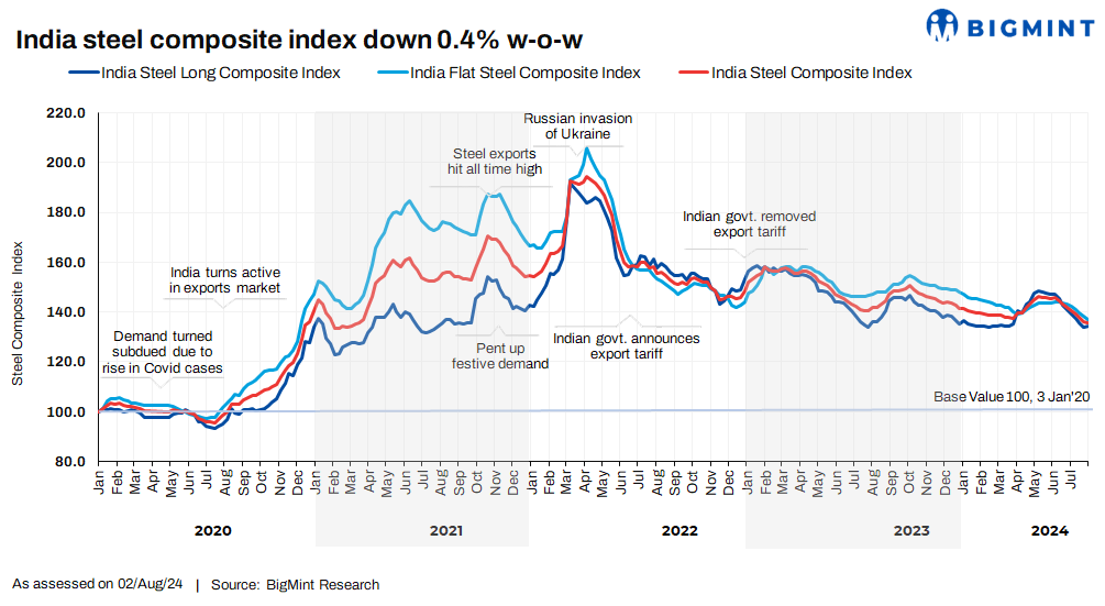 The India Steel Composite Index from January 2020 to August 2024, However this week the India’s steel composite index shown a downward trend 0.4% w-o-w.