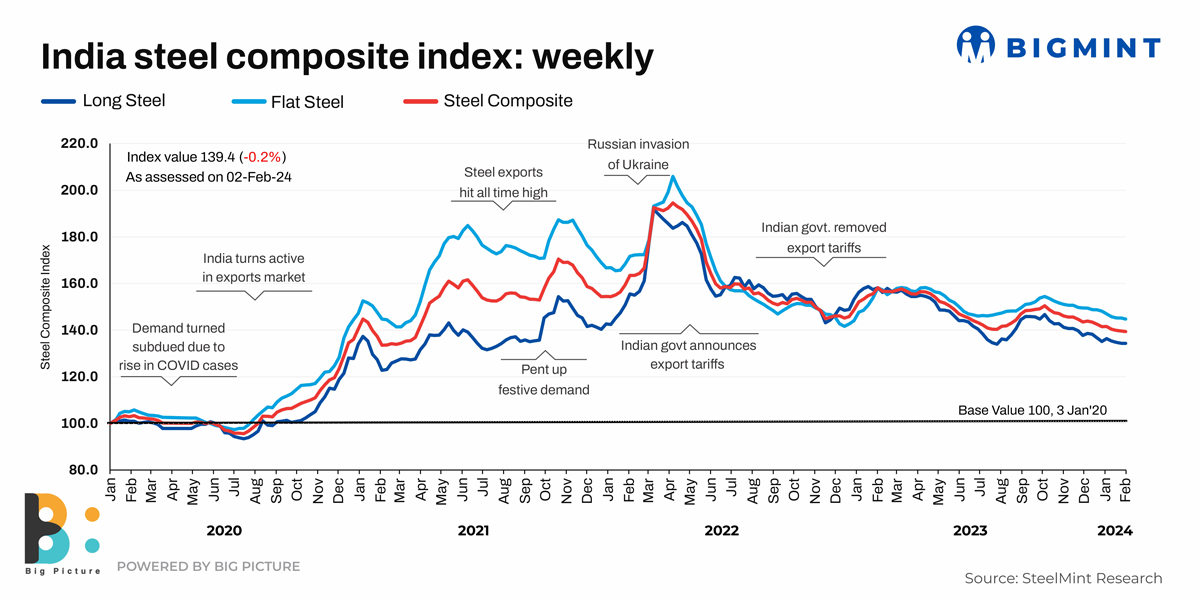 The India Steel Composite Index remained stable for the week ending 2 February, 2024. It may be recalled, in the preceding week, the index had fallen to a two-year low. But the market can take heart from the fact that the index did not experience a further drop but remained flat at 139.40 points compared to the previous close of 139.60.