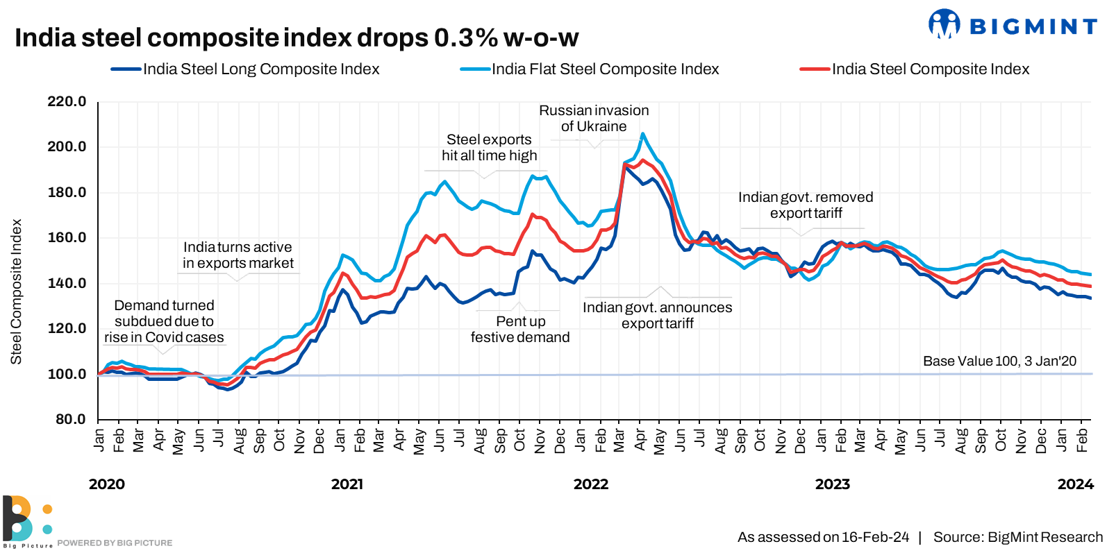 The India Steel Composite Index fell to an almost two-year low for the week ended 16 February, 2024, although on a w-o-w basis, it remained flat at 138.80 points compared to 139.20 in the preceding week. Levels comparable to last Friday’s closing were seen on 26 March, 2021 (136.8).
