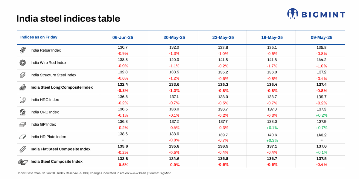 Indian steel prices continued their downward trajectory in June 2025 after a lacklustre May amid global and domestic headwinds affecting the sector. BigMints India steel composite index a barometer of the domestic steel market fell by 0.5% w-o-w on 6 June, with long steel prices dropping more steeply than flats. While the flats composite index dropped 0.2% w-o-w, the longs index recorded a 0.8% decline. In May, the flagship index had slipped by 2.7%, which indicates that the 12% provisional safeguard duty on imports of flat steel, which had come into force in mid-April, failed to have a sustained positive impact on the market amid global uncertainty and deterioration in steel prices.