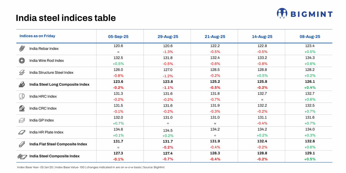 Morning Brief: BigMint’s flagship India steel composite index, a barometer of the domestic steel market, continued to decline w-o-w, remaining at nearly 5-year lows due to the steady downtrend in steel prices. Seasonal slowdown and global uncertainties have kept prices under pressure.