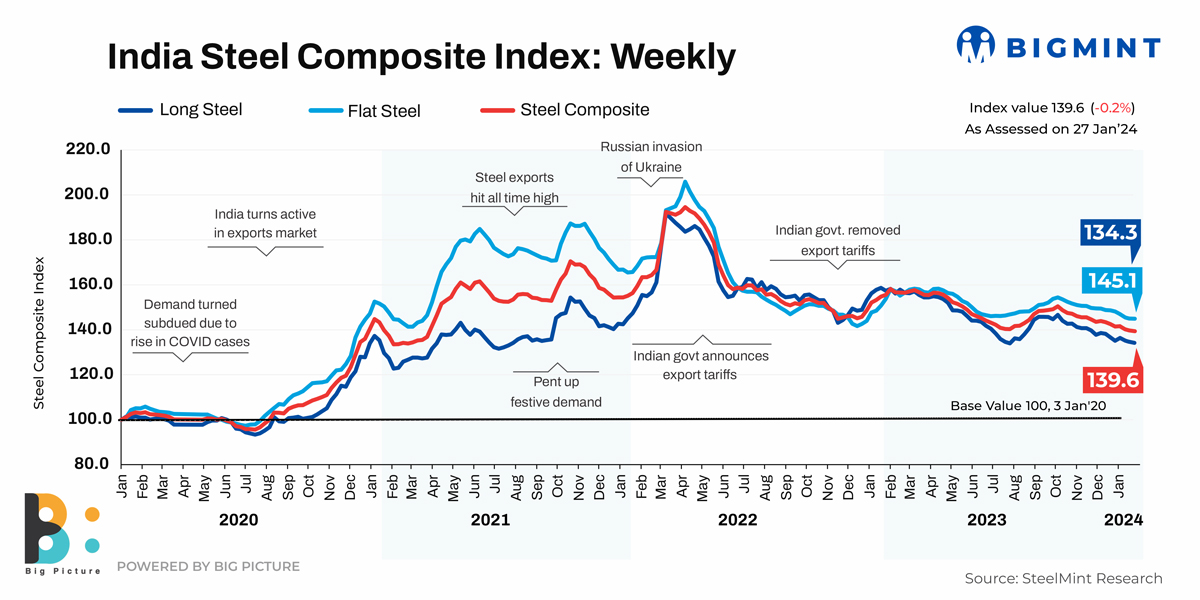 The India Steel Composite Index fell to a two-year low for the week ending 27 January, 2024. Similar levels were last seen on 22 January, 2022. The index last week saw a further dip of 0.2% to 139.60 points. It has been consistently falling for 16 weeks in a row to hit the two-year low last Saturday.