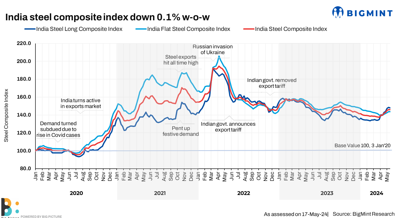 Morning Brief: After a six-week positive run, the BigMint India Steel Composite Index moved into a marginally negative zone for the week ended 17 May 2024, when it closed 0.1% down at 145.9 points (146.1). But, still, the index retained its 6-month high level for the second consecutive week. Similar levels were last seen on 3 November, 2023.
