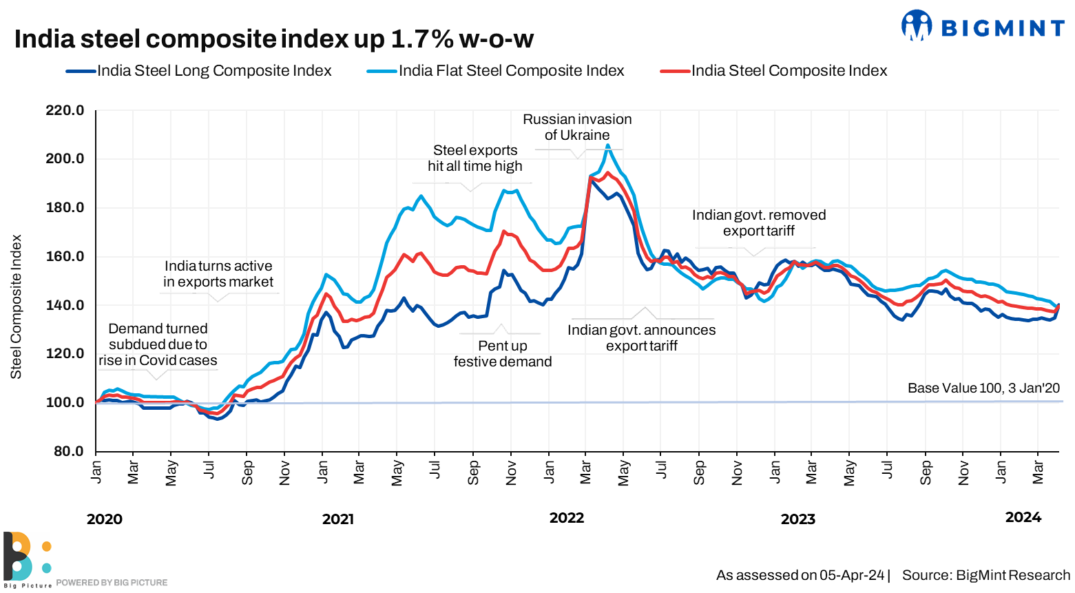 Morning Brief: Breaking out of months of range-bound movements, the BigMint India steel composite index rose to over a year high of 1.7% w-o-w, closing on 6 April at 139.8 points (137.5 points). Similar levels were last seen on 3 February, 2023. Longs fared slightly better although the flat steel index continued to be on the backfoot.