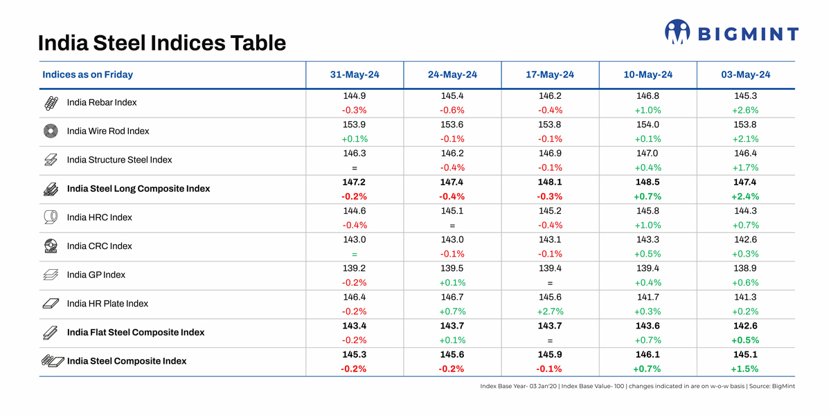 Morning Brief: The BigMint India Steel Composite Index dipped further marginally w-o-w when it closed on 31 May, 2024. With this last closing, the index has remained in negative zone for three consecutive weeks. But, it may also be noted, the index has been hovering at a six-month high for around five weeks now, thanks to some pre-election demand pull.