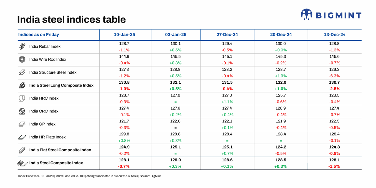 Morning Brief: The BigMint India Composite Steel Index entered the negative zone yet again after a three-week positive run. The index has been fluctuating a great deal, albeit in a narrow range for months now. On 10 January, 2025, it closed down an insignificant 0.7% at 128.1 points against 129 seen on 3 January.