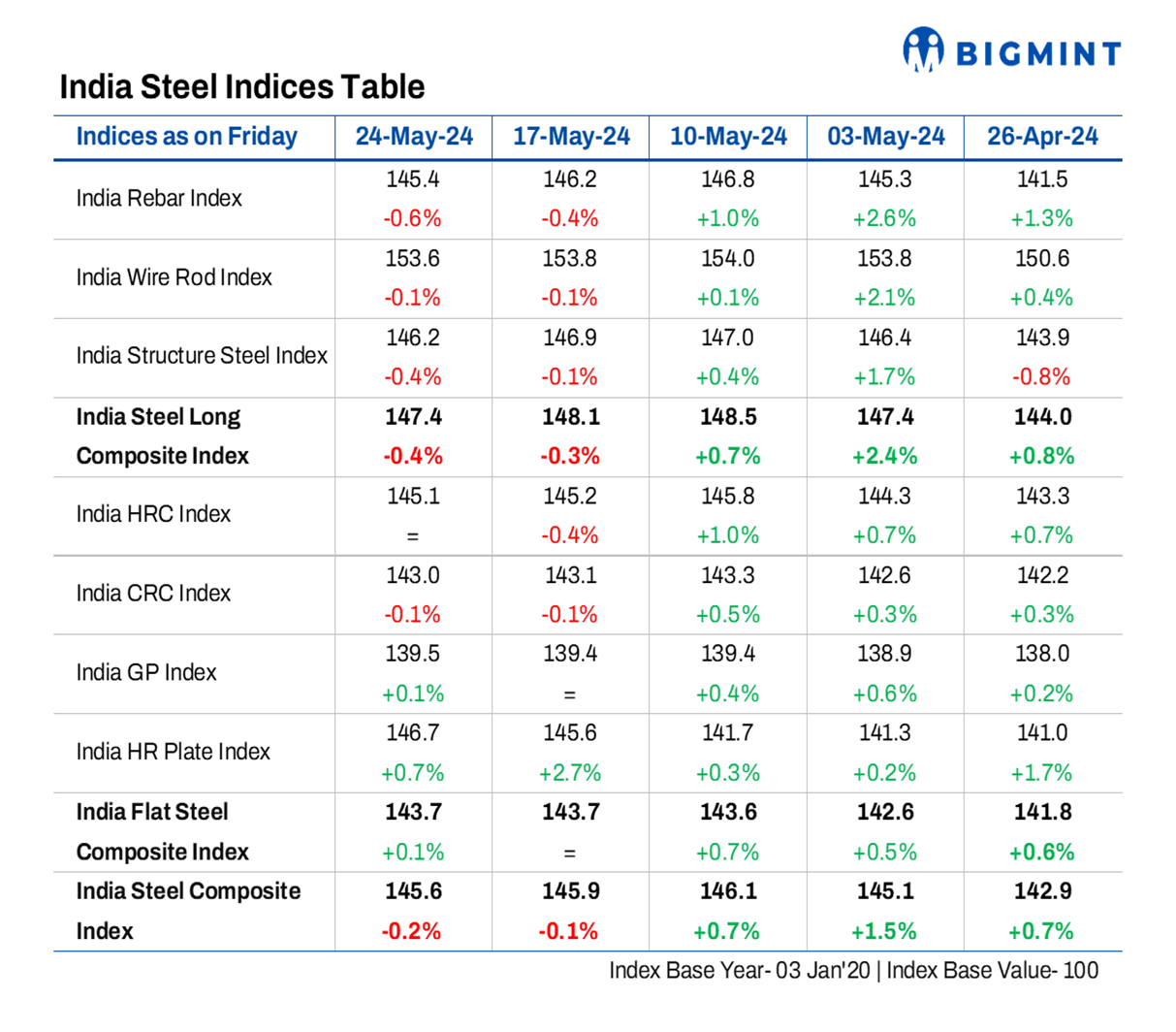 BigMint considers the Composite Index with the base year being 3 January 2020 (financial year 2019-2020) and the base value as 100. The Composite Index does not give the absolute price but a trend of the market. The Indian steel industry is broadly classified into the BF-BOF and the electric/induction furnace routes. Keeping this broad classification in view, BigMint proposes to release the Composite Index by considering both production routes by manufacturing capacity and the production weighted method to compute the index for India.