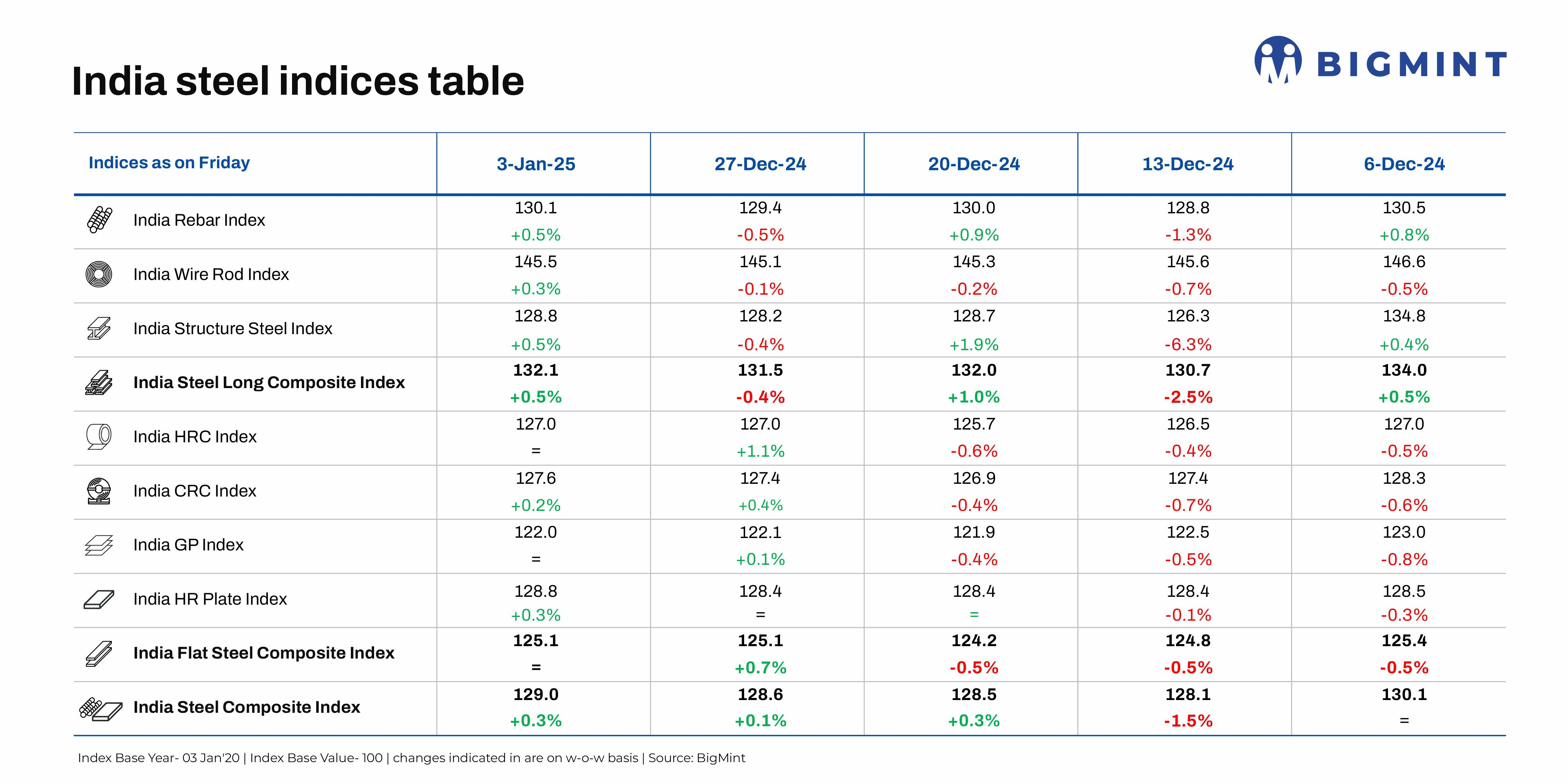 Morning Brief: The New Year started on a mellow note for the Indian market, with BigMint’s Steel Composite Index crawling up by 0.3% w-o-w to settle at 129.0 points on 3 January 2025.