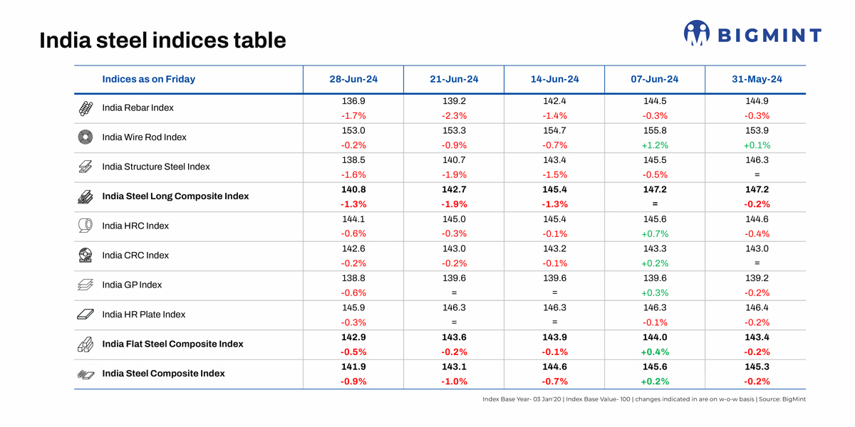 The BigMint India Steel Composite Index dropped further to close at an 11-week low. It has been falling for three consecutive weeks now and slight bearish sentiments are gripping the market with the onset of the monsoon rains. On 28 June, it ended down by 0.9% w-o-w at 141.9 points (143.1). Both the longs and flats indices fell w-o-w, the former by over 1%.