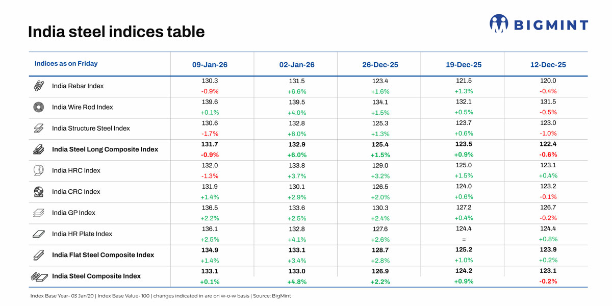 Morning Brief: BigMint’s flagship India steel composite index, a barometer of the domestic steel market, remained in positive territory in the week ending 9 January 2026, although the market euphoria of the previous week died down, with the sudden price surge moderating significantly. The previous week had seen the index surging by over 4% w-o-w, the highest on a weekly basis in close to four years.
