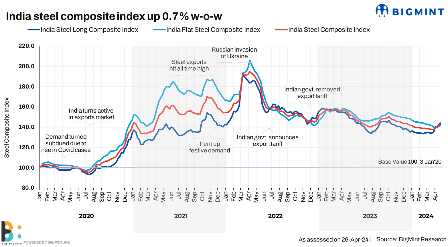 BigMint considers the Composite Index with the base year being 3 January 2020 (financial year 2019-2020) and the base value as 100. The Composite Index does not give the absolute price but a trend of the market. The Indian steel industry is broadly classified into the BF-BOF and the electric/induction furnace routes. Keeping this broad classification in view, BigMint proposes to release the Composite Index by considering both production routes by manufacturing capacity and the production weighted method to compute the index for India.