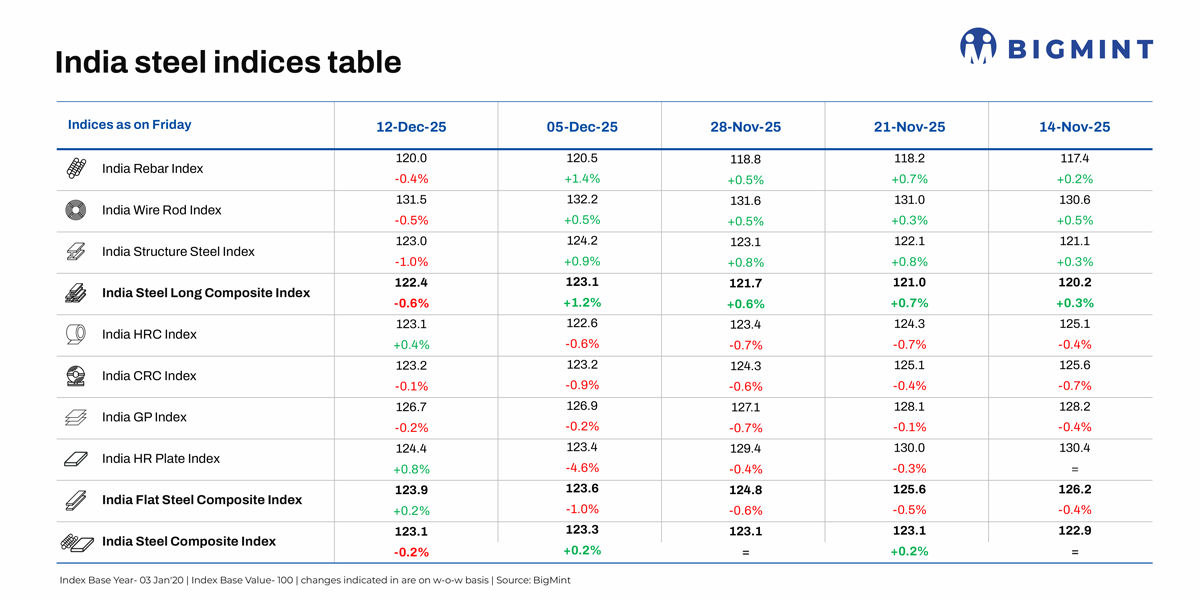 Morning Brief: BigMint’s India steel composite index pared gains witnessed last week to fall back to late-November levels, as per latest assessments on 12 December 2025, with steel market conditions remaining weak. Domestic billet prices across markets dropped in the range of $3-11/t w-o-w last week, and sponge iron and metallics, too, saw a decline.