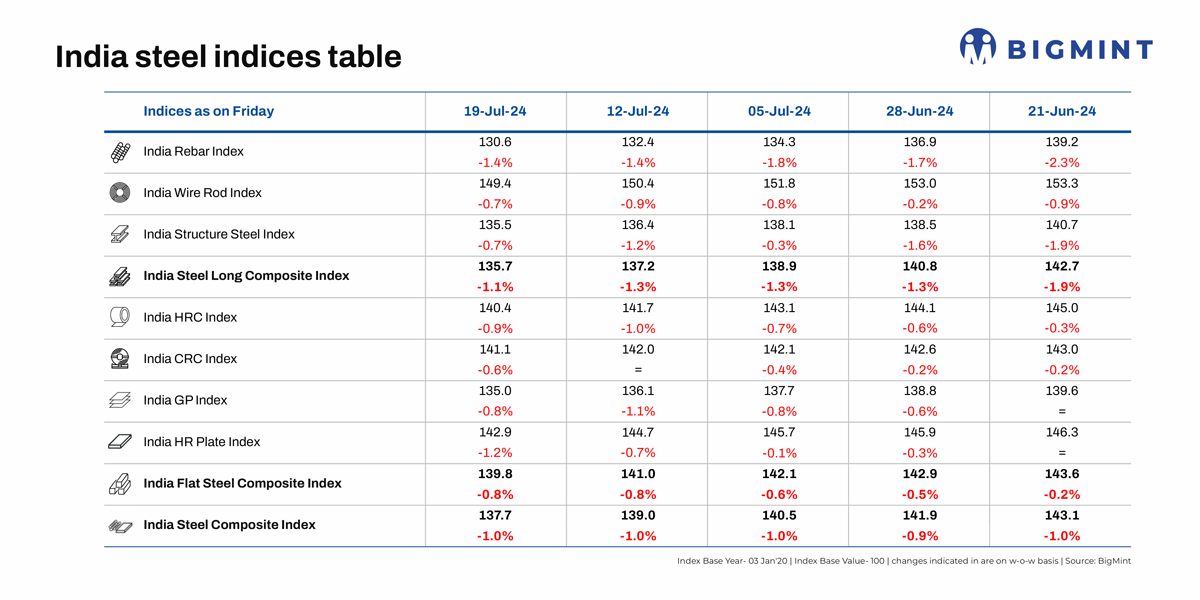 Indian steel prices are in a firm bear grip for weeks now. The BigMint India Steel Composite Index has fallen by 1% for three consecutive weeks. On 19 July, 2024, it dropped 1% to a 16-week low to end at 137.7 points against 139 seen on 12 July. While flats dipped 0.85%, longs fell over 1% w-o-w, dragging down the index further.