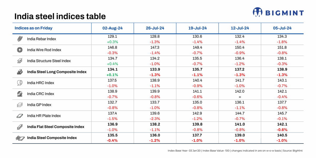 The BigMint India Steel Composite Index is now grovelling at three-and-a-half year lows. On 2 August, 2024, the index closed at 135.5 points, dropping a further 0.4% w-o-w.