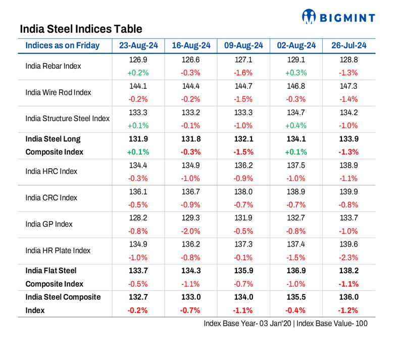 The BigMint India Steel Composite Index further edged down by 0.2% to 132.7 points for the week ending 23 August, 2024.