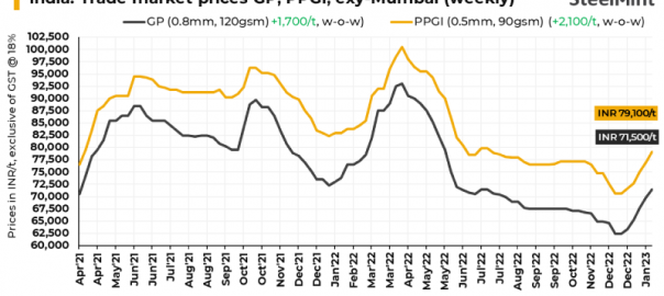 The trade-level prices of cold rolled coils (CRCs), a major substrate material required for manufacturing value-added coated steels, are also on the rise. The trade prices of CRCs (IS513 Gr O, 0.9mm) stood at INR 63,500/t ($784/t) exy-Mumbai as on 18 January in contrast with INR 59,200/t ($731/t) exy-Mumbai assessed on 28 December 2022.