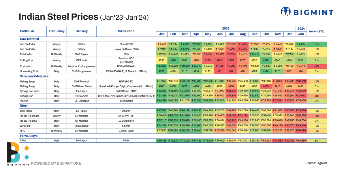 Billets: The ex-Raipur billet index dropped 1% to INR 39,880/t in January, 2024 (INR 40,200/t in December) amid a fall in finished steel demand and sponge iron prices.