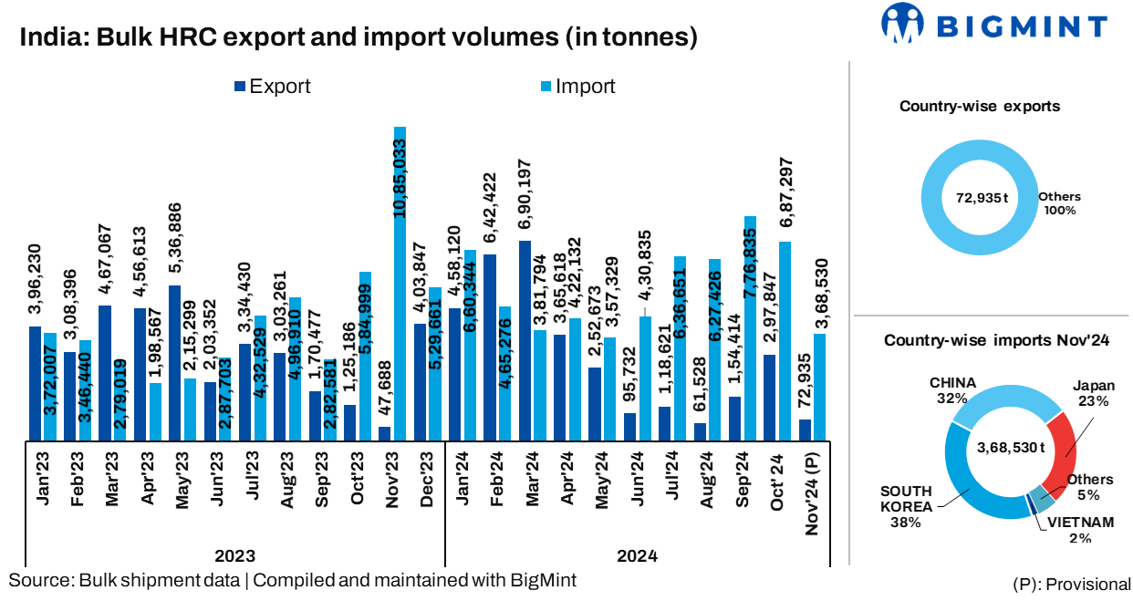 Indian steelmakers booked 10,000 t of HRCs from South Korea at around $530-$540/t CFR India for Dec’24 deliveries. India’s overall HRC imports, as per BigMint’s vessel tracking data, touched 368,530 t on 18 Nov’24, with an additional 86,235 t expected by month-end. Previously, import volumes were substantially higher, at 687,297 t in Oct’24 and 776,835 t in Sep’24.