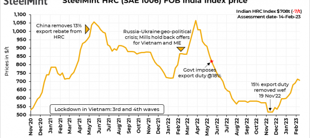 1. Chinese export offers still on lower side: Chinese HRC export offer prices have largely remained lower against the expectations of the market. Market participants opined that offers from the country shall rise steeply post the Lunar New Year holidays. Offers for HRC (SS400) stood around $645/t FOB Rizhao just before the holidays, but have risen by a mere $15/t to $660/t FOB as on 14 February 2023.