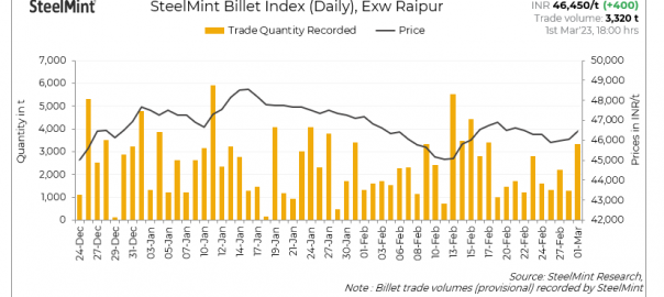 SteelMint’s billet index increased by INR 400/t to INR 46,450/tonne (t) exw-Raipur on 1 March, 2023.
