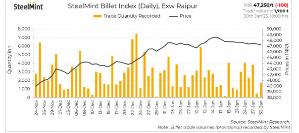 SteelMint’s billet index declined to INR 47,250/tonne (t) (- INR 100/t) exw-Raipur on 30 January, 2023.