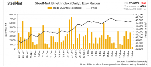 SteelMint’s billet index fell by INR 150/tonne (t) to INR 47,350/t exw-Raipur on 28 January, 2023.