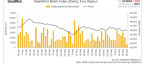 SteelMint’s billet index decreased by INR 200/t to INR 45,900/tonne (t) exw-Raipur on 18 March, 2023.