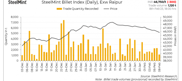 SteelMint’s billet index fell by INR 300/tonne (t) to INR 45,750/t exw-Raipur on 8 February, 2023.
